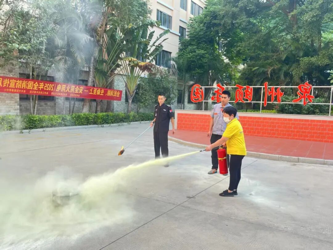 在灭火实操环节,工作人员在专业指导下,轮流上场,亲身体验了如何使用干粉灭火器扑灭初起火灾。从“提、拔、握、压”的步骤到对准火源根部喷射,每一步都力求标准、高效,切实提升了员工的实战能力。